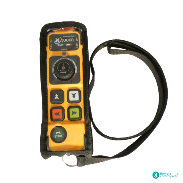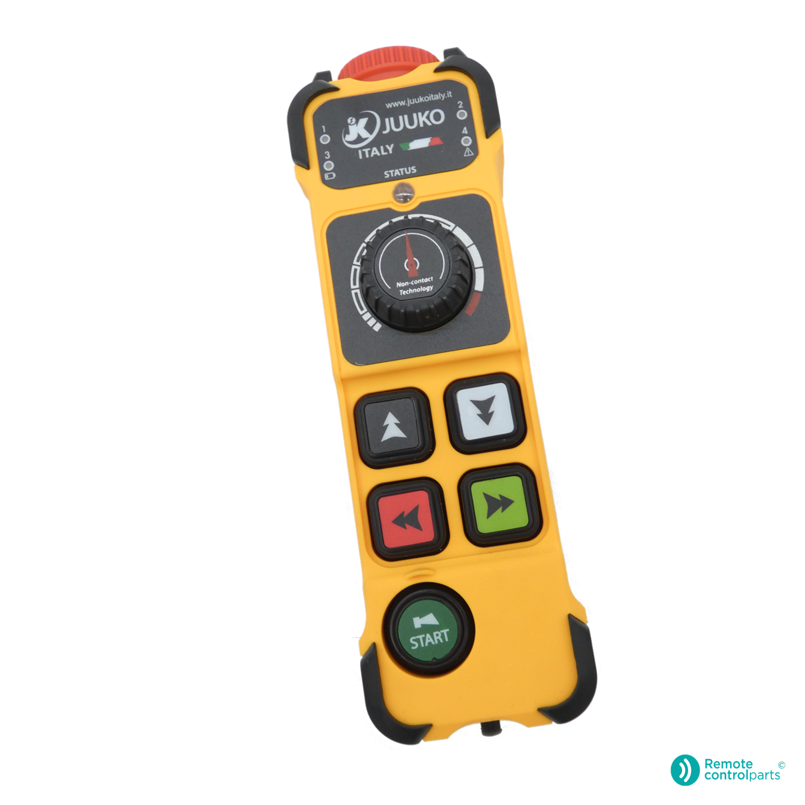 Juuko® Sender K404R: 4 Drucktasten, 1 Potentiometer, Start- und Stopptaste.